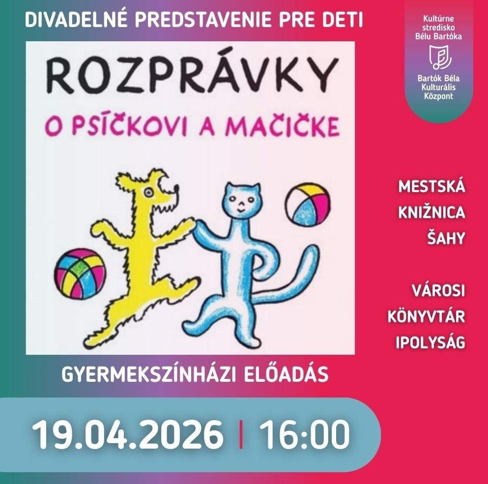 Gyerekprogram O PSÍKOVI A MAČIČKE 2026. április. 19. - 16:00 Mestská knižnica Šahy Színházi előadás gyermekeknek szlovák nyelven. Jegyinformáció A belépés díjtalan. Következő programjaink: Kiállítás Négy évtized impressziói 2026. április. 13. - 30. Simonyi Lajos Galéria Kiállítás „ÉS AKKOR BECSUKTÁK AZ ABLAKOKAT” - Emlékek a váci és az ipolysági zsidóság életéről, sorsáról 2026. április. 16. - 11:00 Menora Saag Centrum Artis Gyerekprogram O PSÍKOVI A MAČIČKE 2026. április. 19. - 16:00 Mestská knižnica Šahy Koncert NOTHING BUT SWING TRIO a SCOTT HAMILTON 2026. április. 23. - 18:00 Menora Saag Centrum Artis Színház NICSAK, KI LAKIK ITT? 2026. április. 28. - 19:00 Városháza színházterme Minden program