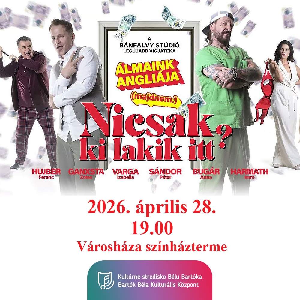 Színház NICSAK, KI LAKIK ITT? 2026. április. 28. - 19:00 Városháza színházterme vígjáték két részbenBánfalvy Stúdió FŐBB SZEREPEKBEN: Varga Izabella, Hujber Ferenc, Ganxsta Zolee, Sándor Péter, Bugár Anna Jegyinformáció Belépő: 18 eurJegyeket a Turisztikai Információs Irodában lehet megvásárolni:ElérhetőségFő tér 7C, 936 01 Šahy - Ipolyságtel.: +421 911 084 299e-mail: infotour@sahy.sk Következő programjaink: Színház NICSAK, KI LAKIK ITT? 2026. április. 28. - 19:00 Városháza színházterme Minden program